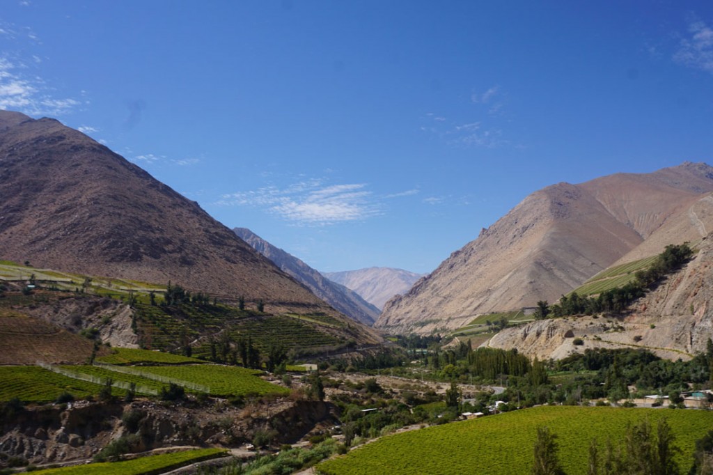 Después de dejar atrás el desierto de Atacama llegamos al pequeño oasis del Valle del Elqui. Una zona rodeada de cerros áridos que gracias a los recursos hídricos y sus largos periodos de sol la hace una tierra de las de mayor producción de vinos, frutas y vegetales. Especialmente el cultivo de la uva para hacer Pisco (para que los que no habéis probado nunca el Pisco Sour, no sabéis lo que os perdéis! Peligrosamente bueno y mejor no tomar más de dos en una noche.)